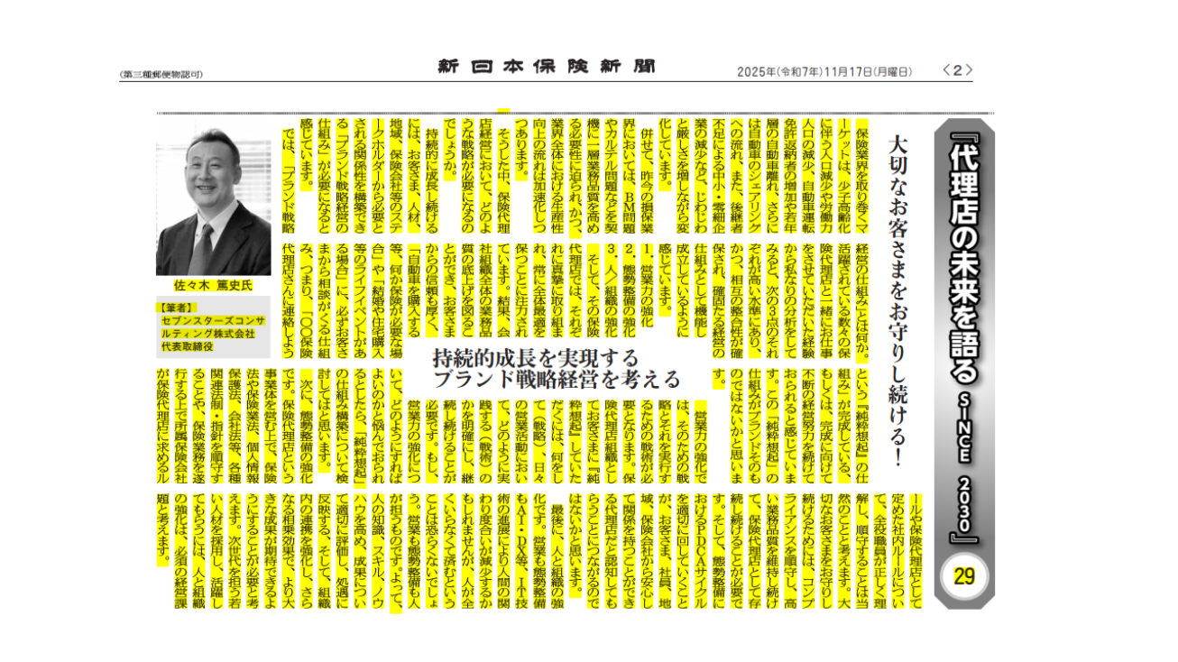 - 2025年5月:保険代理店ブランド戦略プログラムが新日本保険新聞に掲載されました!